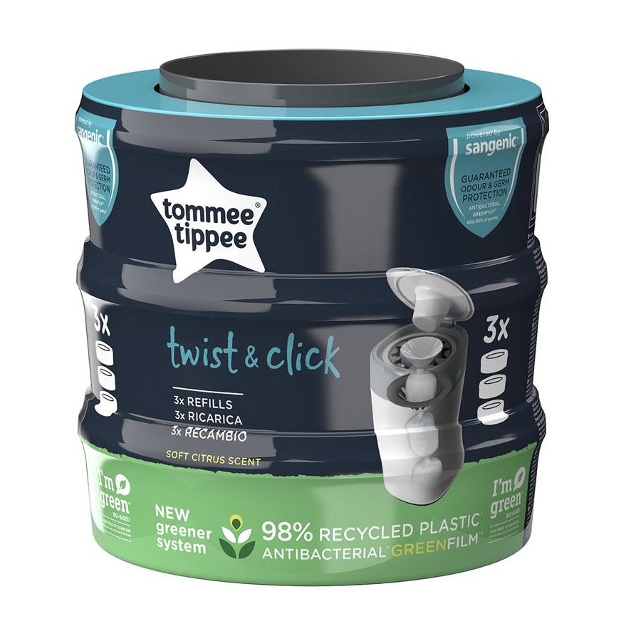 Ανταλλακτικά κάδου απόρριψης πάνας Twist & Click της Tommee Tippee x3 ειδικά σχεδιασμένα, για να διασφαλιστεί ότι κάθε πάνα είναι ατομικά τυλιγμένη σε αντιβακτηριδιακό φιλμ που μπλοκάρει τα μικρόβια και τις οσμές.