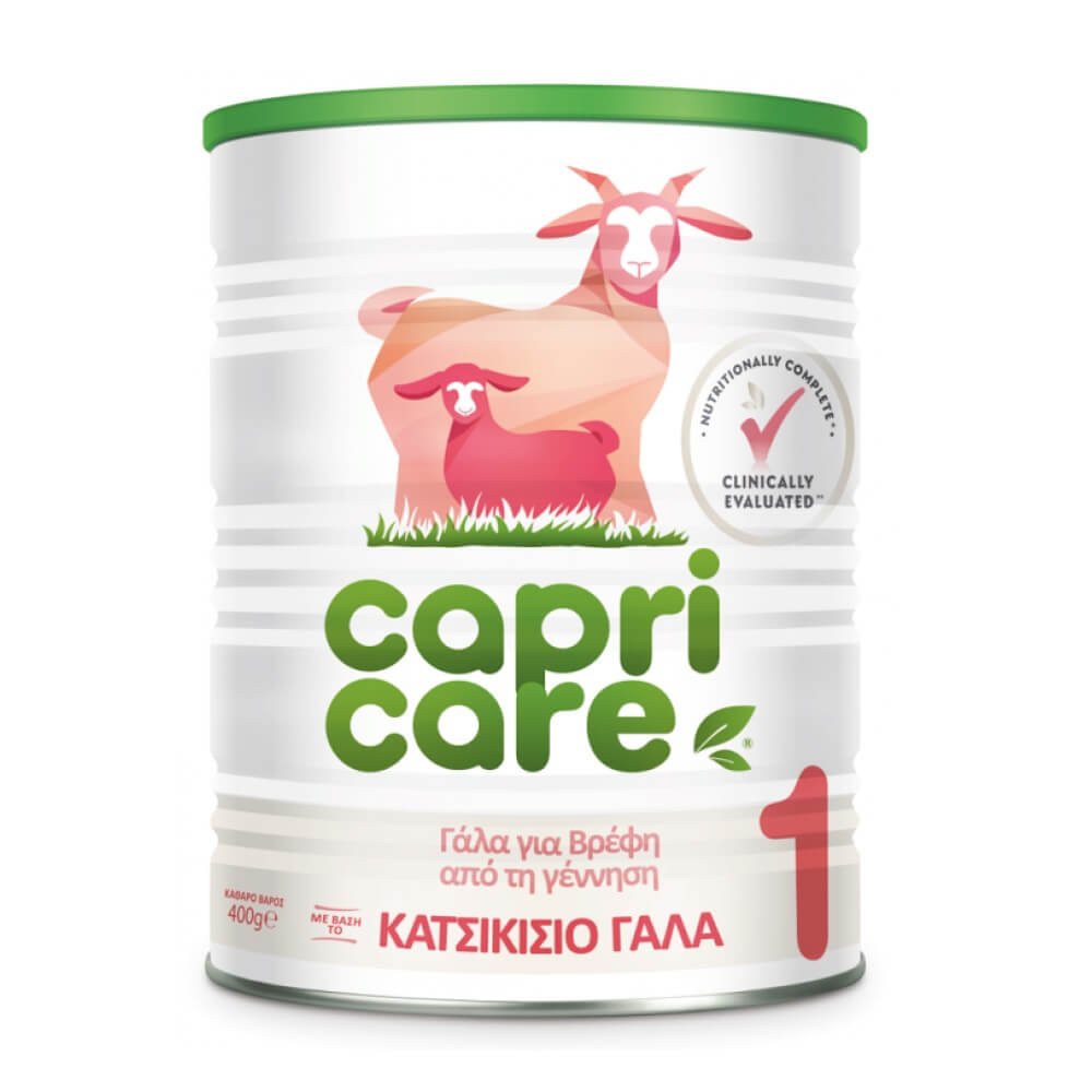 Κατσικίσιο γάλα Capricare 1 για βρέφη 0m+ 400g σε σκόνη για τη διατροφική κάλυψη βρεφών από τη γέννηση έως τον 6° μήνα και για την περίοδο του απογαλακτισμού. Παρασκευάζεται με πρώτη ύλη το πλήρες κατσικίσιο γάλα, αντί με ανάμιξη συστατικών, με αποτέλεσμα την ηπιότερη δυνατή επεξεργασία.