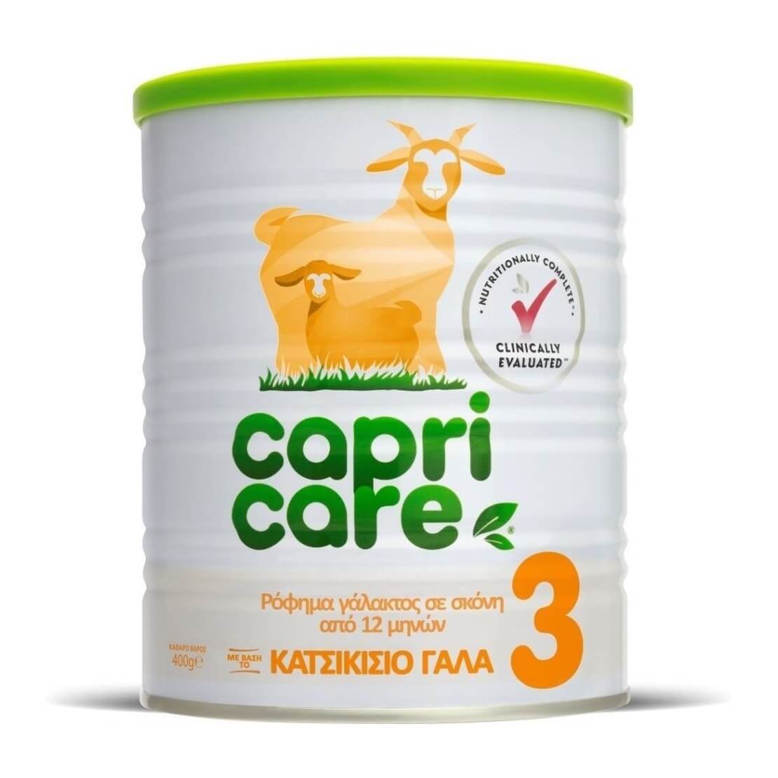 Κατσικίσιο γάλα Capricare 3 για βρέφη 12m+ 400g σε σκόνη για τη διατροφική κάλυψη των νηπίων μετά τον 12° μήνα. Παρασκευάζεται με πρώτη ύλη το πλήρες κατσικίσιο γάλα, αντί με ανάμιξη συστατικών, με αποτέλεσμα την ηπιότερη δυνατή επεξεργασία.