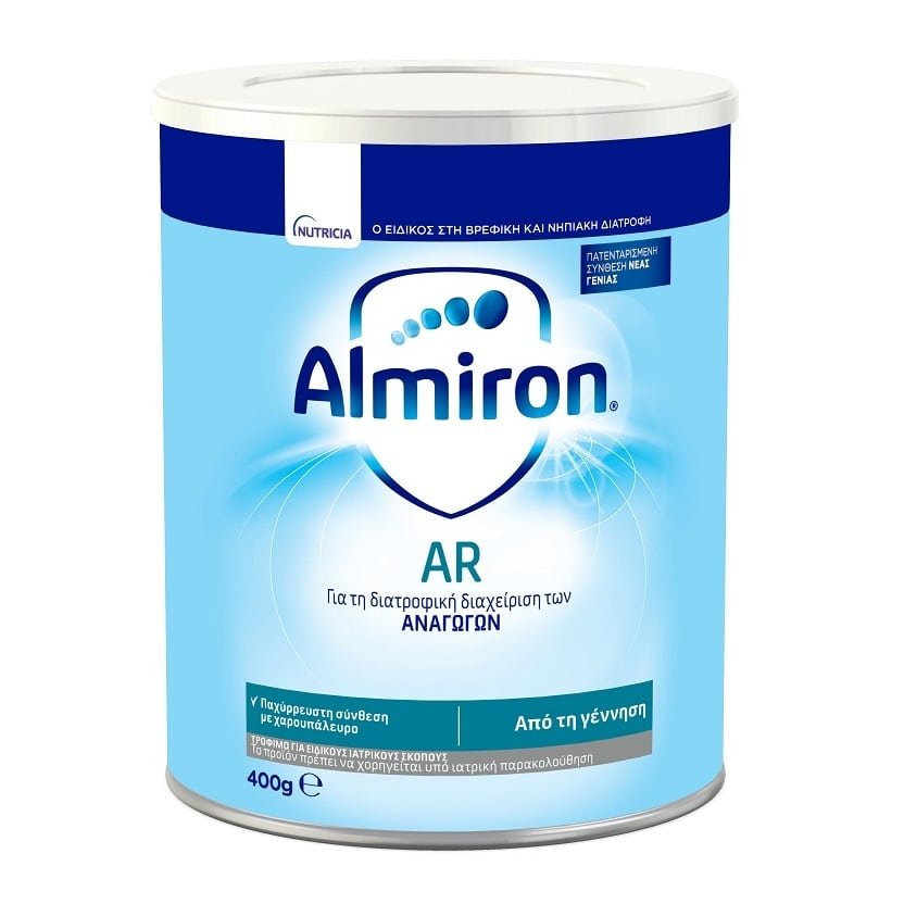 Γάλα σε σκόνη Almiron AR της εταιρείας Nutricia 0m+ 400g για τη διατροφική διαχείριση των αναγωγών, κατάλληλο για βρέφη από τη γέννηση.