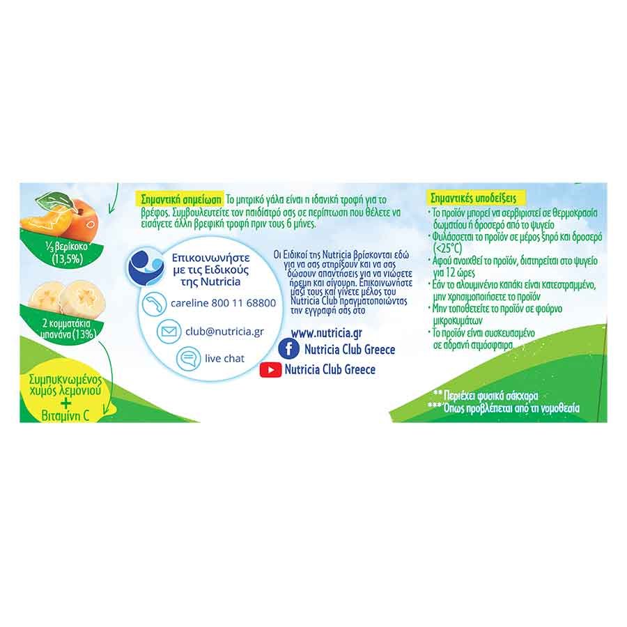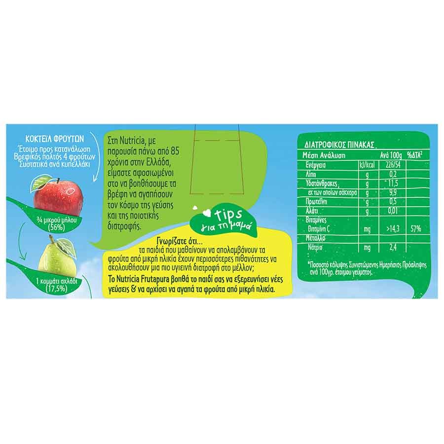 Βρεφικός πολτός 4 φρούτων της εταιρείας Nutricia για βρέφη από τον 6ο μήνα, από 100% φυσικά φρούτα χωρίς προσθήκη ζάχαρης.