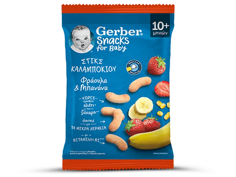 Θρεπτικό σνακ της Gerber με καλαμπόκι, φράουλα και μπανάνα. Περιέχει σίδηρο, ψευδάργυρο και βιταμίνη Β1.