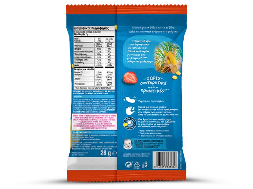 Θρεπτικό σνακ της Gerber με καλαμπόκι, φράουλα και μπανάνα. Περιέχει σίδηρο, ψευδάργυρο και βιταμίνη Β1. Χωρίς πρόσθετο αλάτι & ζάχαρη.
