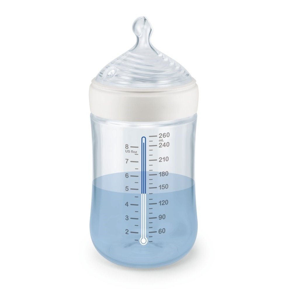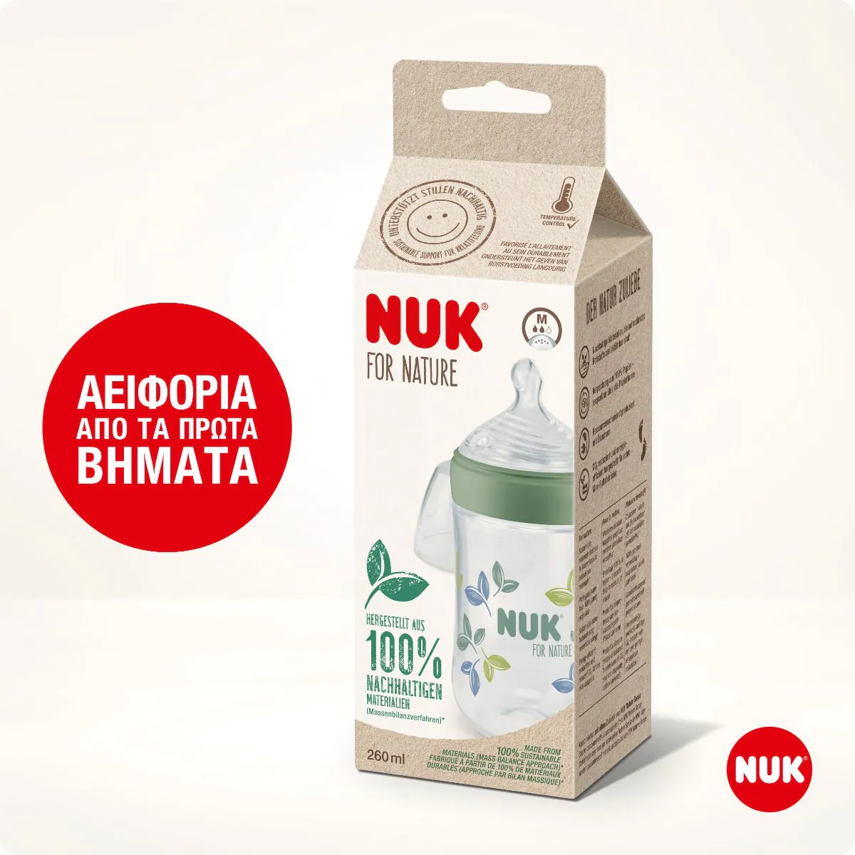 Nuk for Nature Μπιμπερό με Δείκτη Ελέγχου Θερμοκρασίας 260ml, με θηλή από βιώσιμη σιλικόνη, σχεδιασμένη κατά τα πρότυπα του μητρικού στήθους. Θηλή μεγέθους M με 6 μικροσκοπικές οπές (για μέτρια ταχύτητα ροής).