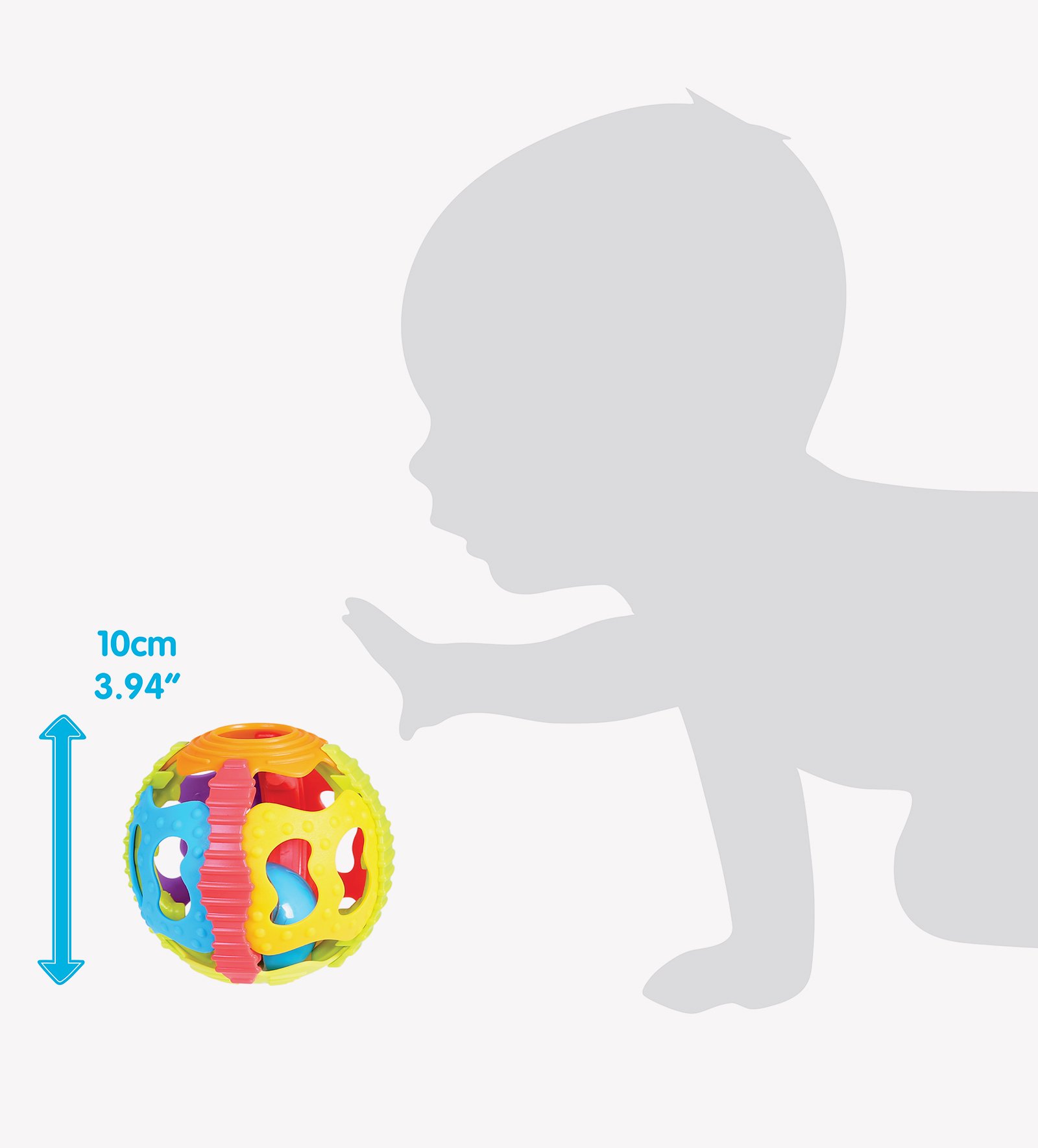 Πολύχρωμη μπάλα Shake Rattle & Roll της Playgro που μπορεί να λυγίσει, ενώ η μικρή μπάλα στο εσωτερικό της κουδουνίζει όταν η μπάλα κουνιέται, διεγείροντας την ακουστική ανάπτυξη του μωρού.