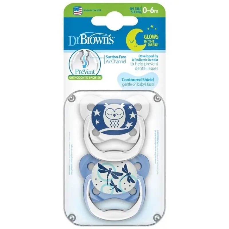 Πιπίλα νυκτός πεταλούδα ορθοδοντική Dr Brown’s Prevent 0-6m Μπλε (2 τεμάχια) που φωσφορίζει για να τη βλέπετε ευκολότερα στο σκοτάδι, σχεδιασμένη ώστε να αποτραπούν οδοντιατρικά προβλήματα.
