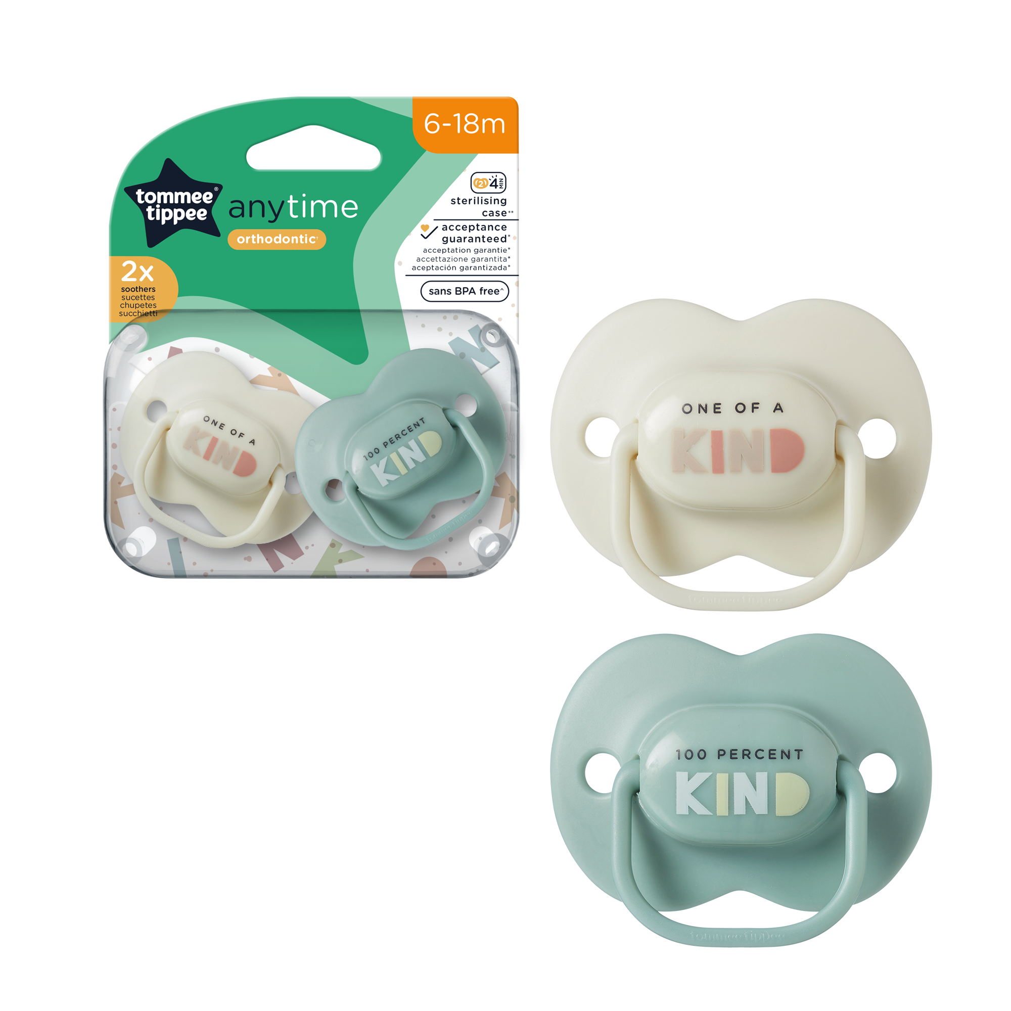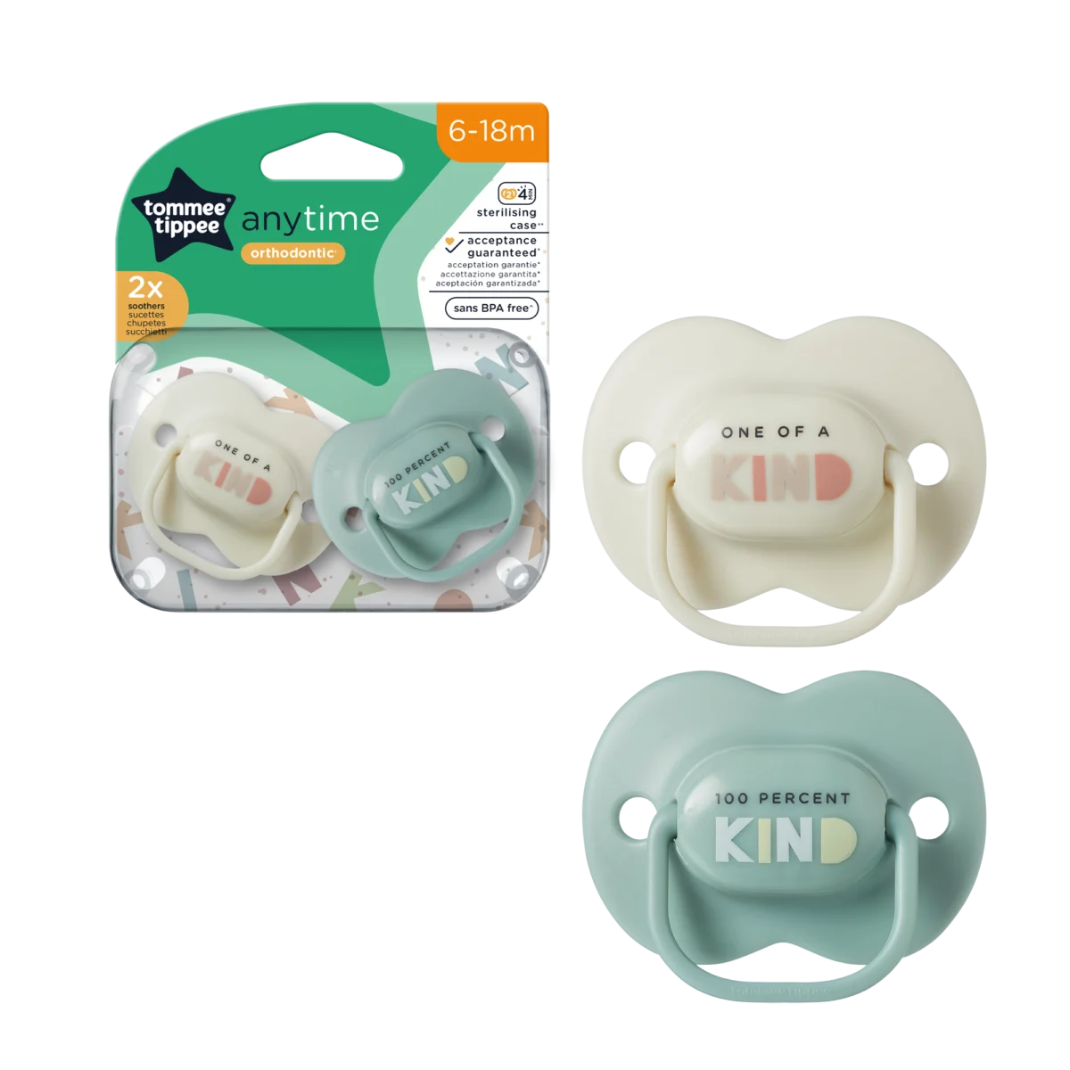 •  Συμμετρικός ορθοδοντικός σχεδιασμός: Οι πιπίλες Anytime διαθέτουν συμμετρική θηλή σιλικόνης, χωρίς κλίση προς τα πάνω, για να τοποθετούνται πάντα σωστά στο στόμα του μωρού.